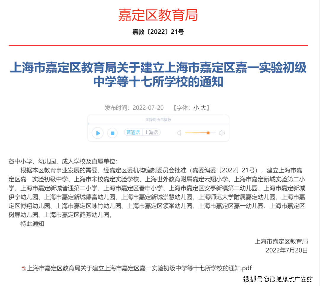 起首,据上海市嘉定区教育局官网发布:上海市嘉定区教育局关于成立上海市嘉定区嘉一尝试初级中学等十七所学校的通知。
